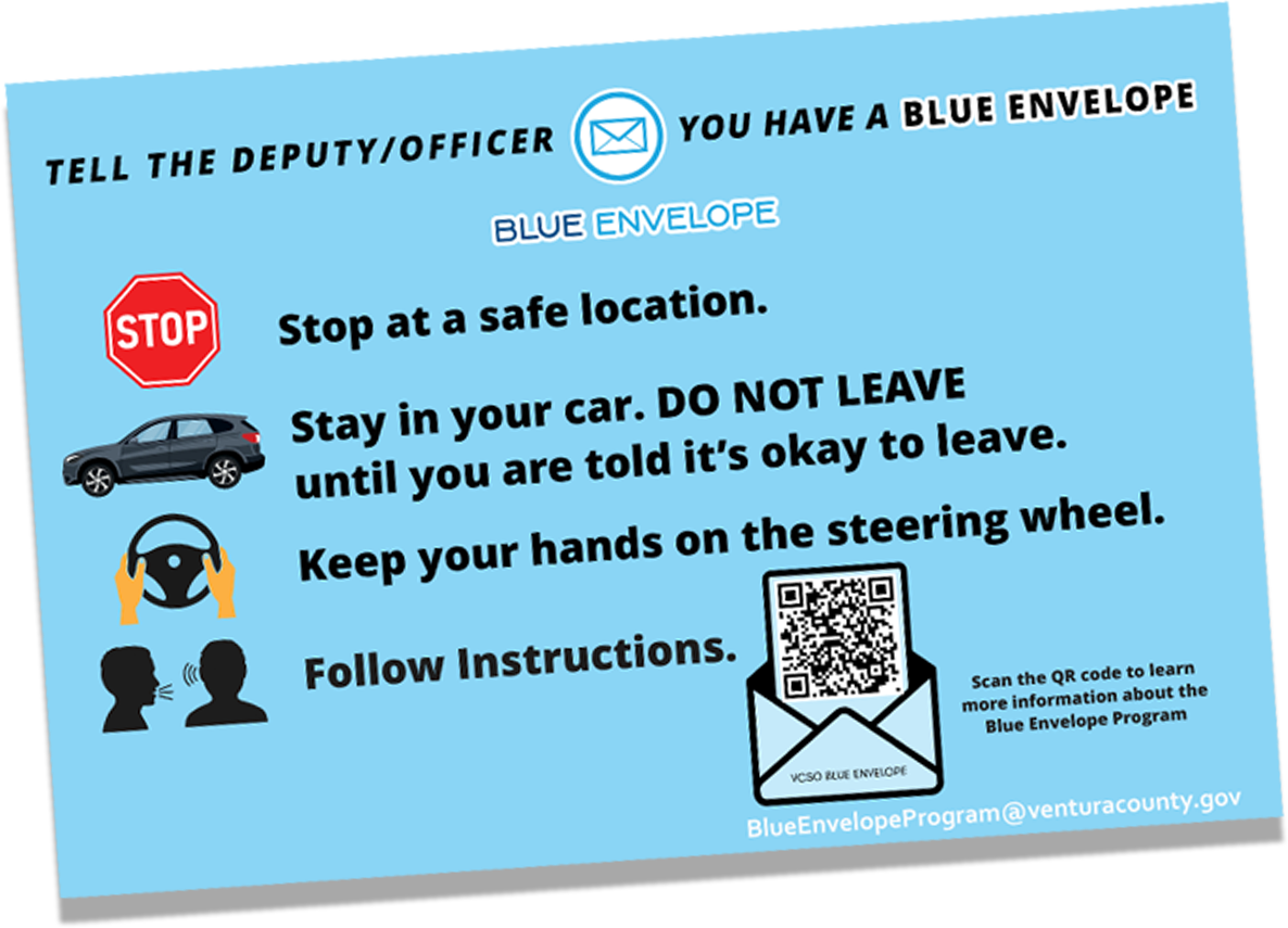 Ventura County proudly presents the Blue Envelope Program. This compassionate initiative was created to foster greater understanding and safer interactions between law enforcement and community members with cognitive, developmental, or mental health conditions such as autism spectrum disorder, dementia, anxiety, or other conditions that may require special considerations.